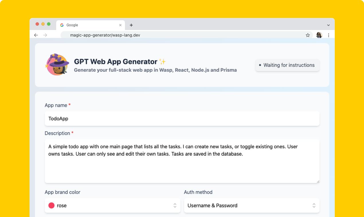 All you have to do in order to use GPT Web App Generator is provide a short description of your app idea in plain English. You can optionally select your app's brand color and the preferred authentication method (more methods coming soon).
